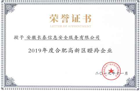 2019年,11月20日,合肥高新区2019年高成长企业榜单正式发布,高新区共认定了502家高成长企业,其中雏鹰企业275家、瞪羚培育企业72家、瞪羚企业149家、潜在独角兽企业3家、独角兽企业1家、平台型龙头企业2家。作为其中的高科技企业——安徽 mk网站-mk(中国)唯一在线官方网站成功入选瞪羚企业榜单。